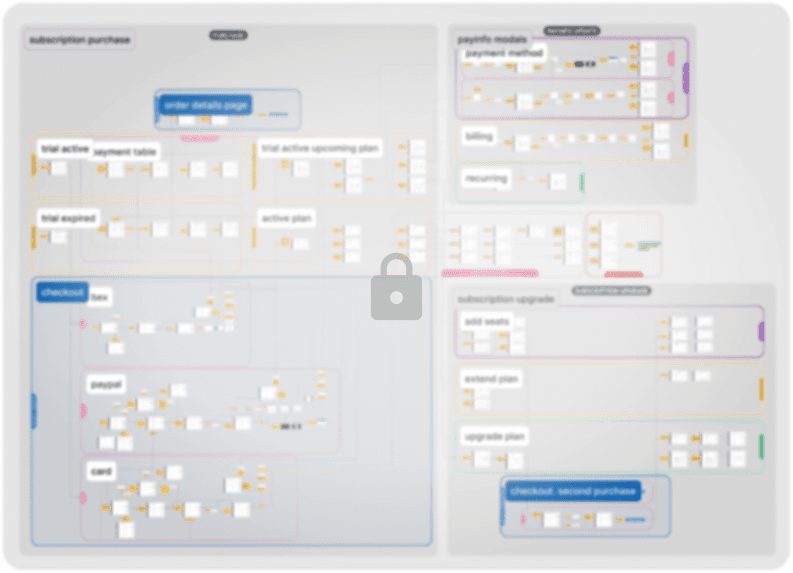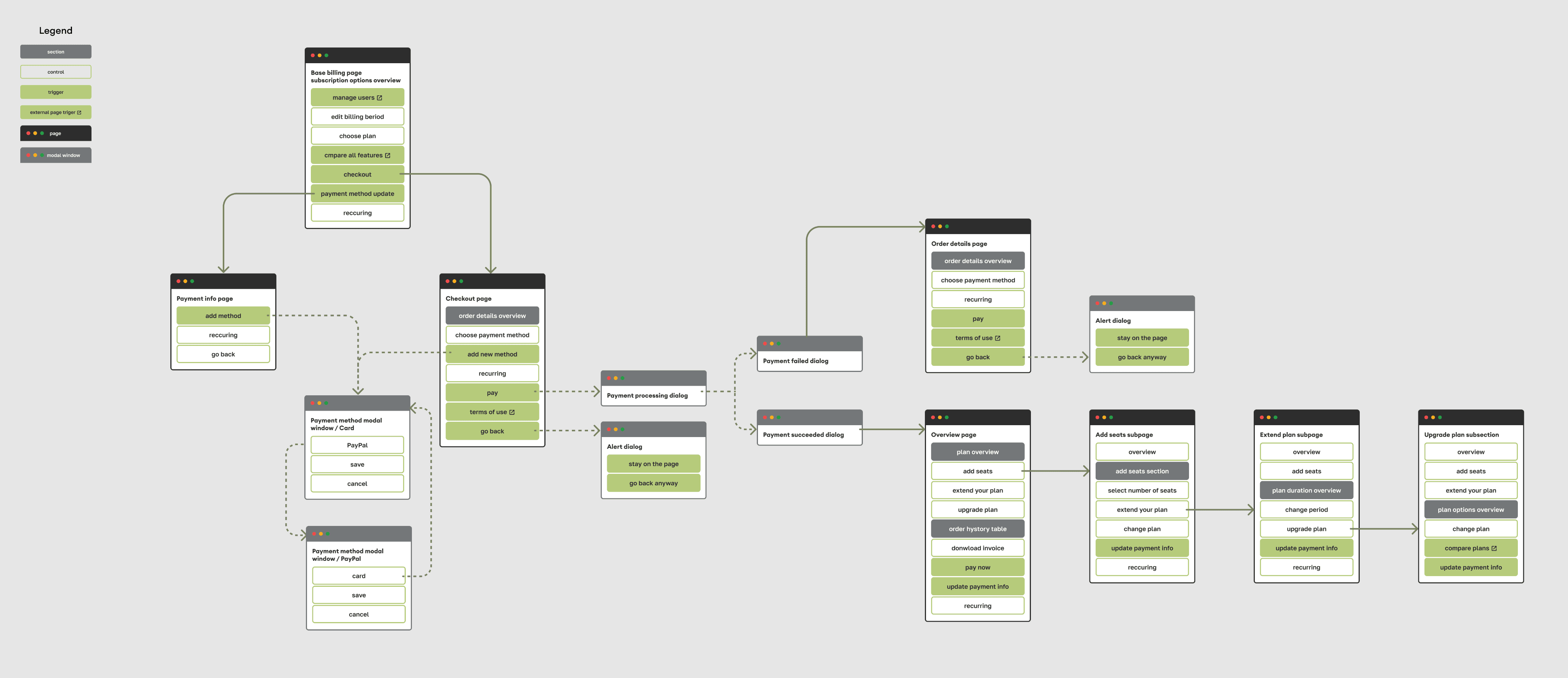 Проработаны флоу первой покупки с оплатой картой, оплатой платежными системами PayPal и Bex. Проработан флоу повторного платежа